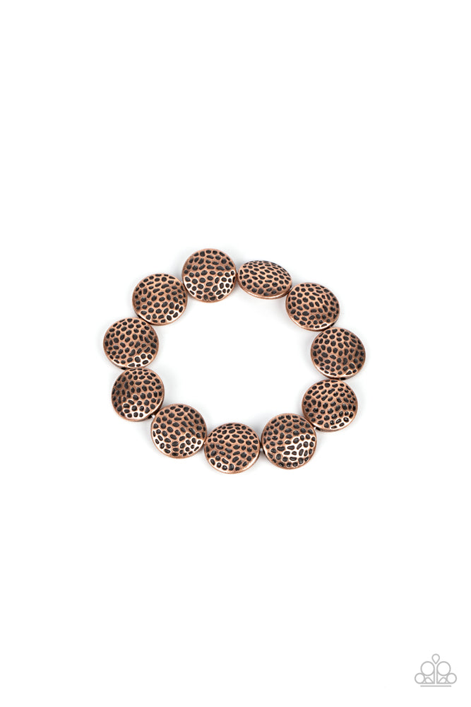 Hammered in antiqued details, a rustic collection of copper beads is threaded along a stretchy band around the wrist for a wildly adventurous look.