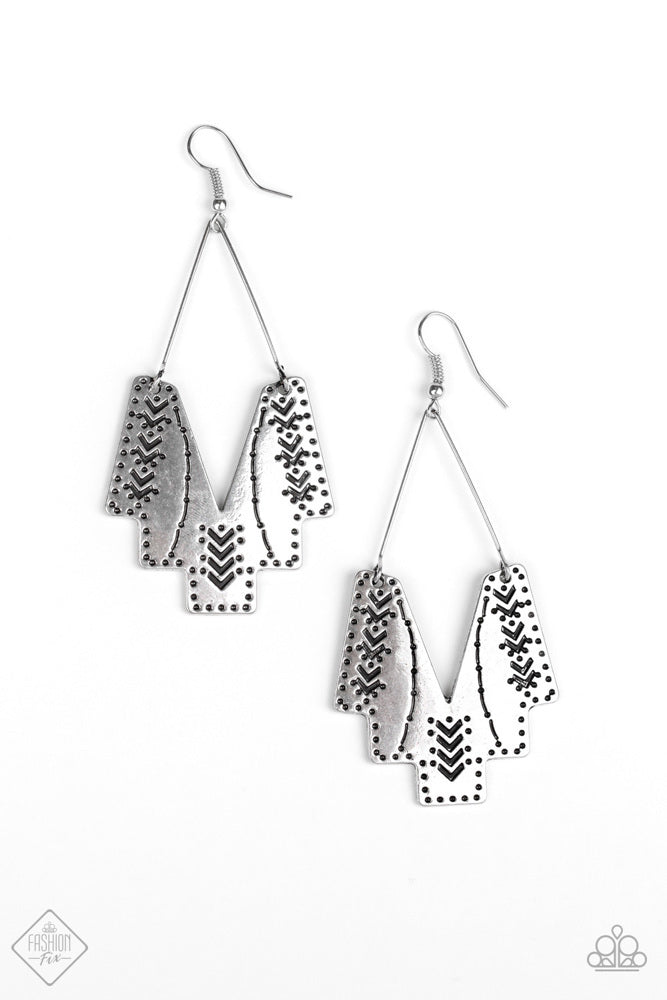 Stamped in tribal inspired patterns, an abstract geometric frame swings from a delicate silver wire fitting for a tribal inspired look. Earrings attach to a standard fishhook fittings.