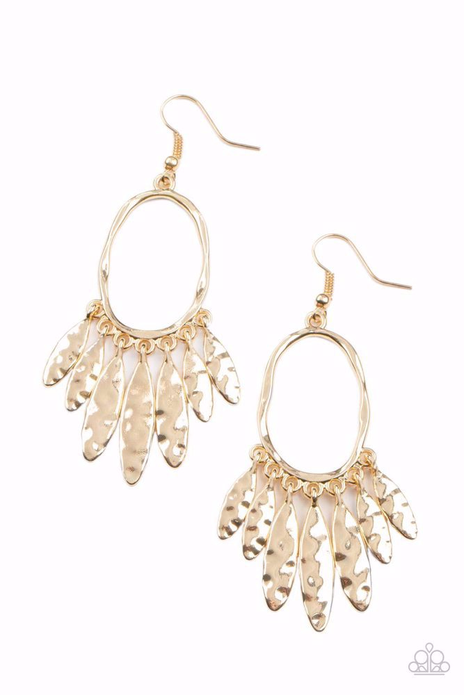 A tapered fringe of hammered gold oval frames swings from the bottom of a hammered oval hoop, creating a musical fringe. The earring attaches to a standard fishhook fitting.