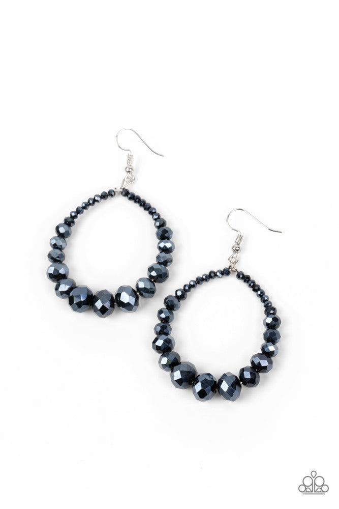 Featuring a flashy faceted finish, metallic blue gems gradually increase in size as they glide along a wire hoop, resulting in an out-of-this-world sparkle. Earring attaches to a standard fishhook fitting.