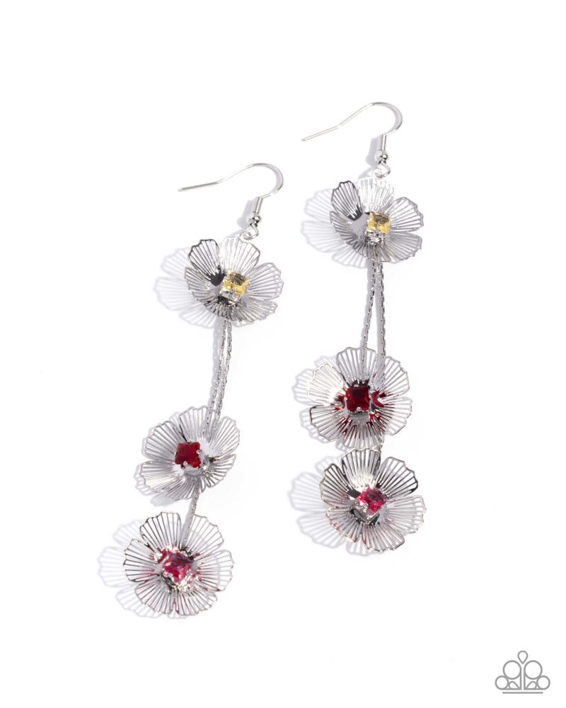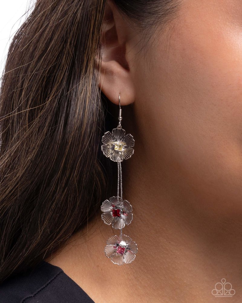 Delicately layered silver petals bloom around alternating yellow, pink, and red square rhinestones, creating a row of airy florals suspended on slender silver snake chains. The dramatic vine of blossoms swings from the ear for a statement-making finish. Earring attaches to a standard fishhook fitting.