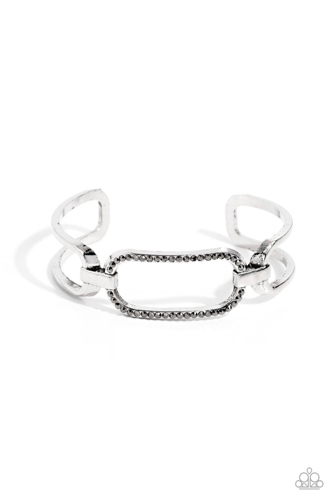 Airy link-like silver frames attach to a hematite rhinestone-encrusted centerpiece, coalescing into a chic cuff around the wrist.
