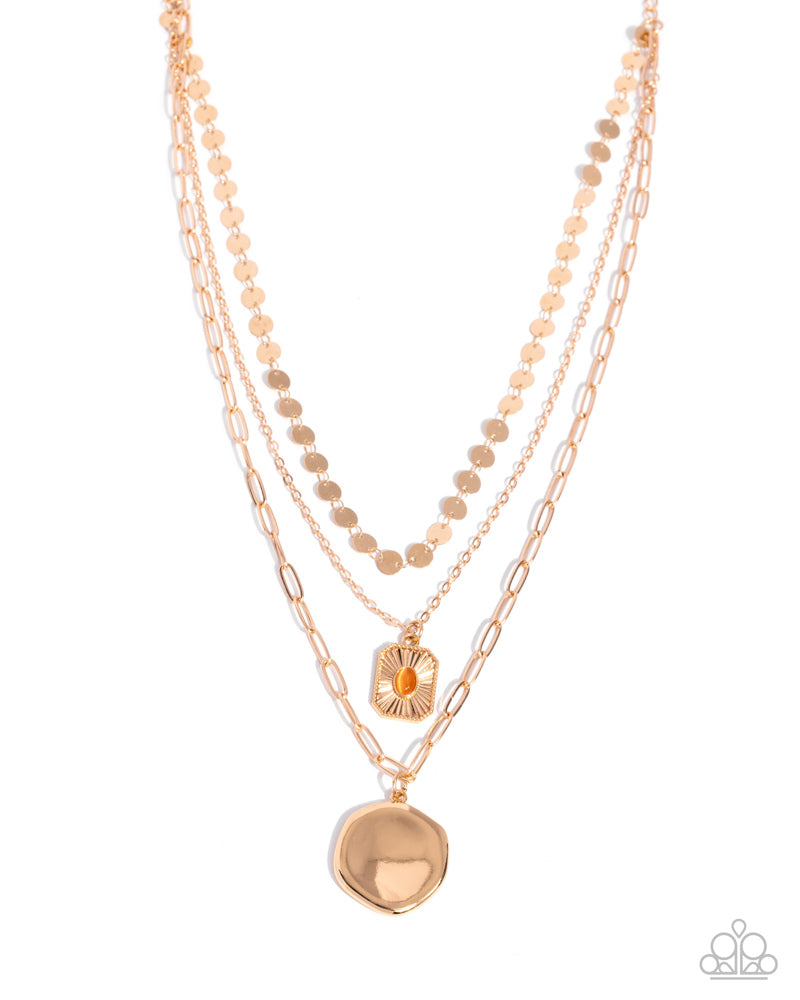 Mismatched dainty, paperclip, and gold soda can tab-inspired gold chains cascade below the neckline in mesmerizing tiers. An abstract pressed gold pendant sways from the lowermost chain, while a sunburst-textured emerald-cut gold frame with an oval orange cat's eye stone glides along the middlemost chain, adding a pop of refreshing color. Features an adjustable clasp closure.