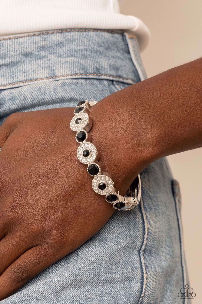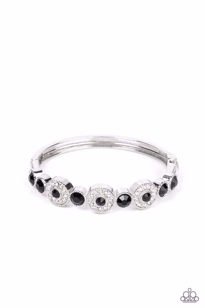 Bordered in rings of glassy white rhinestones, a trio of black rhinestones alternate with oversized black rhinestones across the front of a bangle-like bracelet for a glamorous twist. Features a hinged closure.