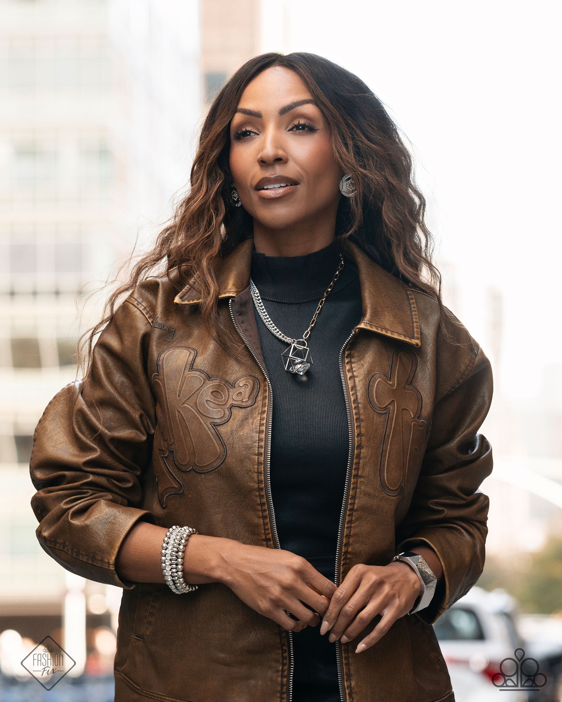 Featuring a high sheen, tactile textured silver comes to a point along the curve around the wrist for a daring and dauntless combo. Features a hinged closure.