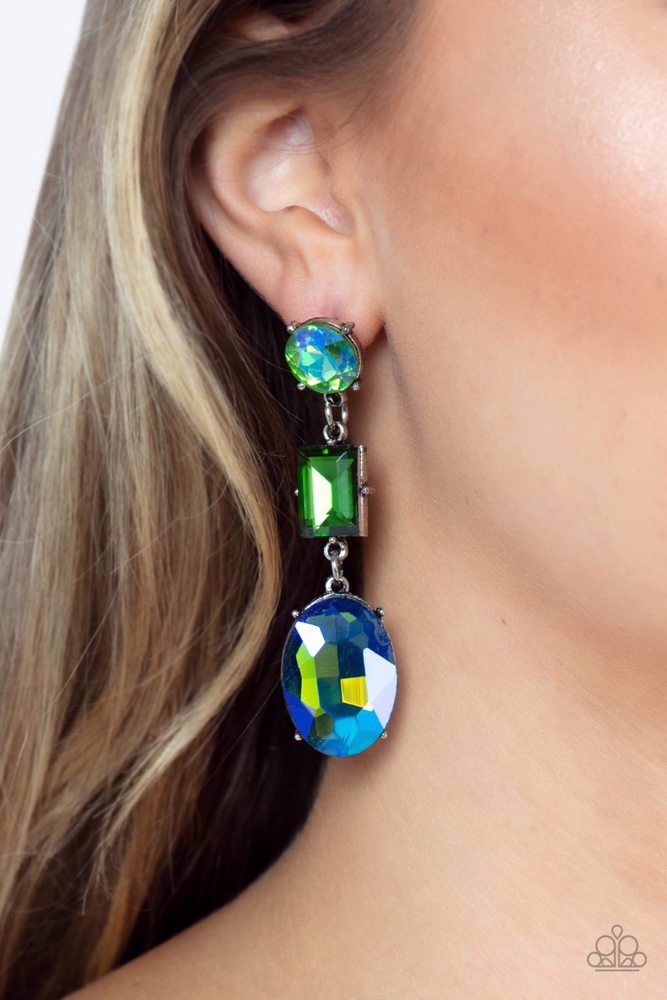 Featuring flashy UV finishes, a classic round green, an emerald cut green, and a blue oval gem, glamorously link into a jaw-dropping lure. The earring attaches to a standard post fitting.