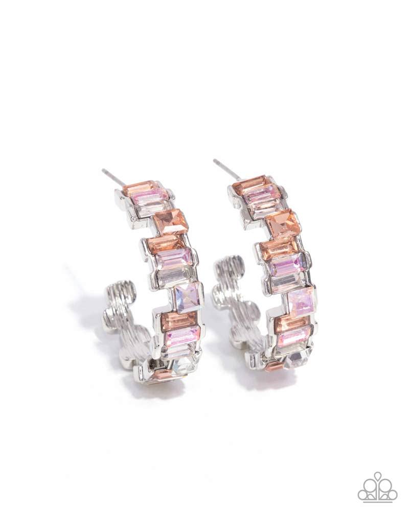 Featuring various orange and multicolored shades, emerald-cut gems set in silver frames stack and curve along the ear in a haphazard manner for a dizzying display. Earring attaches to a standard post fitting. Hoop measures approximately 1" in diameter.