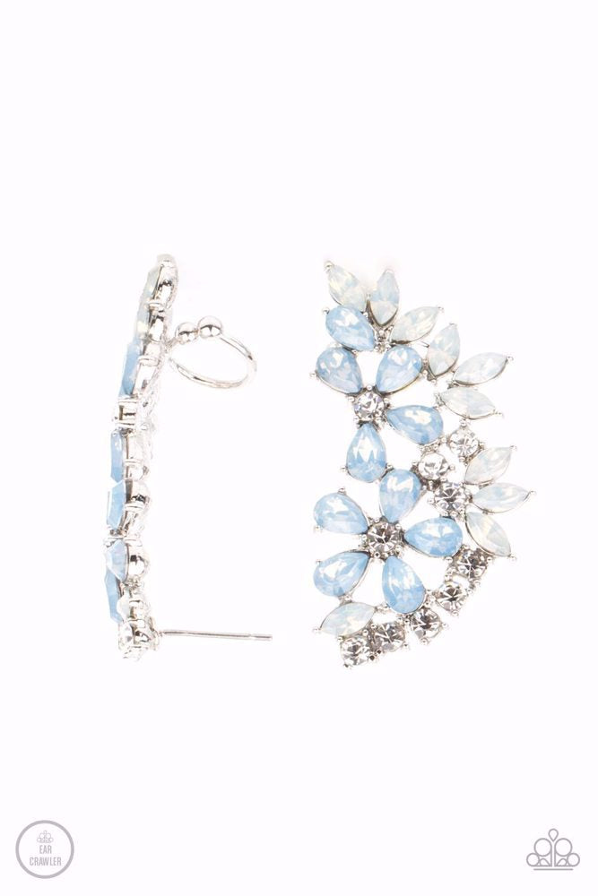 Featuring a milky opalescence, white marquise and Cerulean teardrop rhinestones coalesce into a sparkly floral centerpiece that flawlessly climbs the ear. The earring attaches to a standard post fitting. Features a dainty cuff attached to the top for a secure fit.