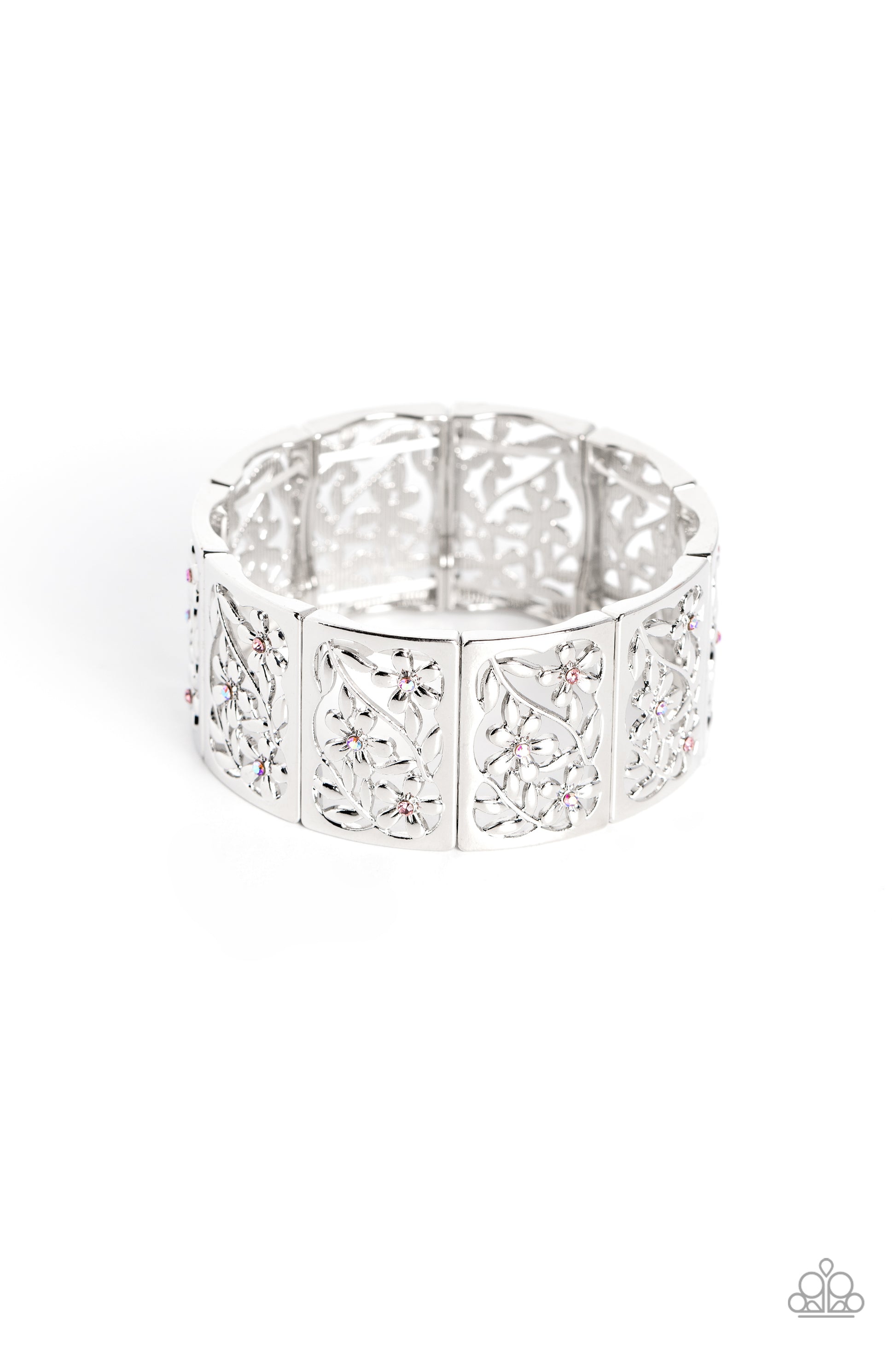 Sleek silver frames, filled with whimsical leafy floral filigree and pink and iridescent rhinestones, stack around the wrist on an elastic stretchy band for a dainty handcrafted statement. Due to its prismatic palette, color may vary.
