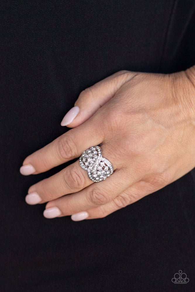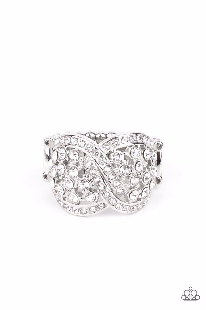 Intertwining white rhinestone-encrusted silver bars delicately connect around clusters of glittery white rhinestones, creating a sparkly infinity across the finger. Features a stretchy band for a flexible fit.