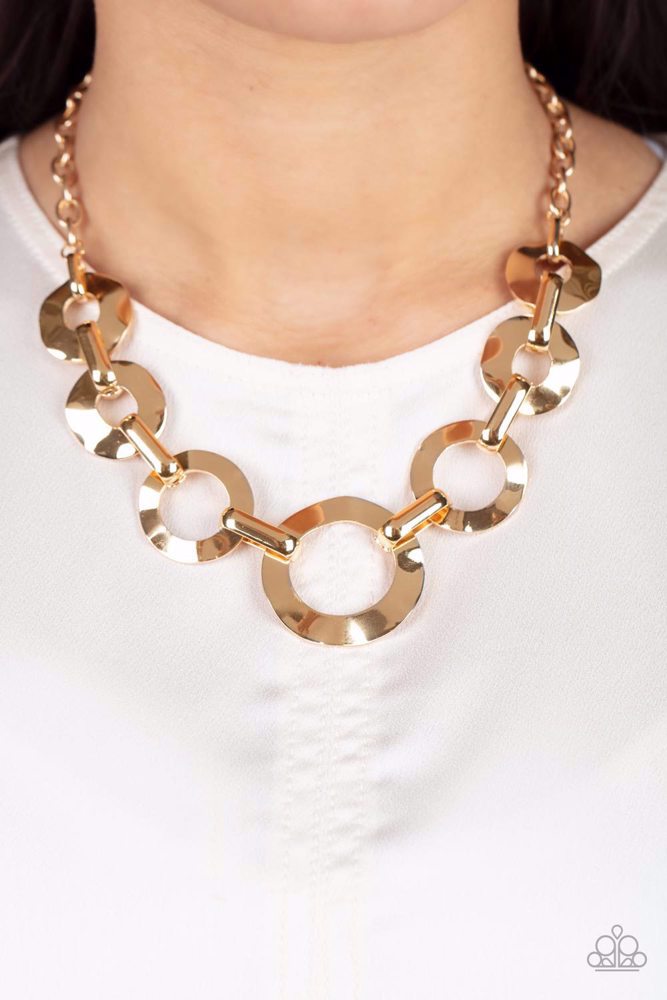Featuring hammered surfaces, crinkled gold rings gradually increase in size as they alternate with bold gold fittings below the collar for an intense industrial fashion. Features an adjustable clasp closure.