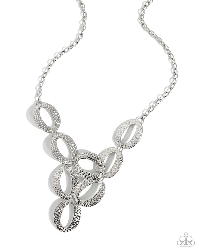 Hammered in shimmery detail, oversized silver ovals delicately link into a dramatic centerpiece below the collar for a refined look. Features an adjustable clasp closure.