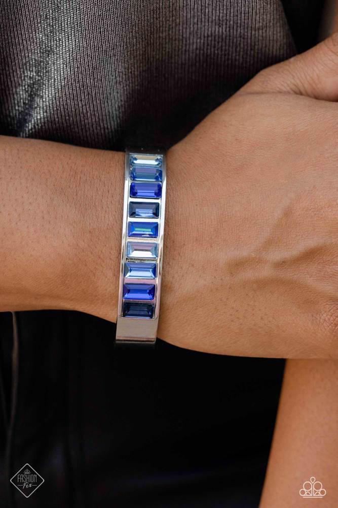 Embedded in the center of a thick, high-sheen silver cuff, a row of glassy emerald-cut gems in varying shades of blue radiates atop the wrist, creating an unexpected pop of color.