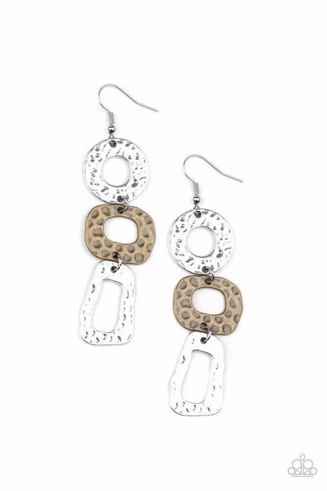 Featuring asymmetrical shapes, a hammered trio of imperfect brass and silver frames links into an edgy handcrafted lure. The earring attaches to a standard fishhook fitting.