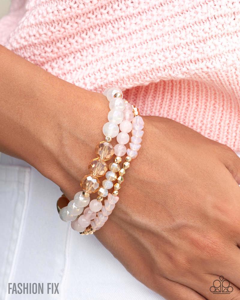 Infused along elastic stretchy bands, a collection of gold accents, iridescent-brushed ivory beads, pink multicolored stone beads, and faceted peach and pink beads in varying sizes and opacities, patterns along the wrist for a mesmerizing stack of sheen and color. As the stone elements in this piece are natural, some color variation is normal.