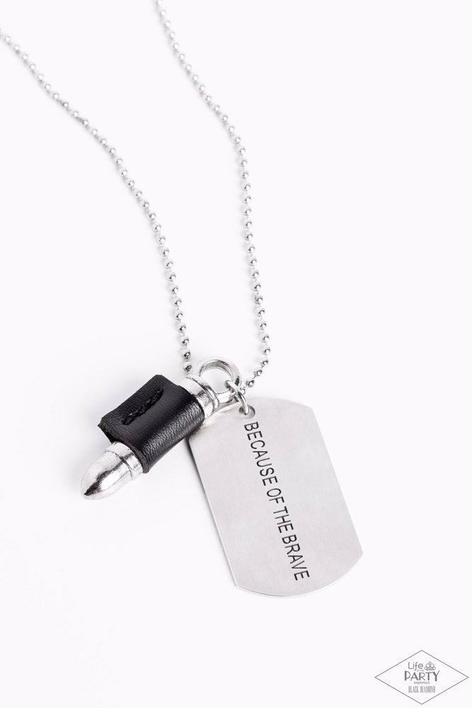Pinched between a black leather fitting, a silver bullet pendant joins a silver dog tag at the bottom of a silver ball chain. The shimmery dog tag is stamped with the phrase, "Because of the Brave," for a patriotic finish. Features a ball and clasp closure.