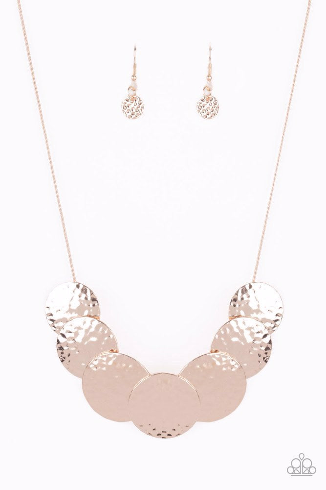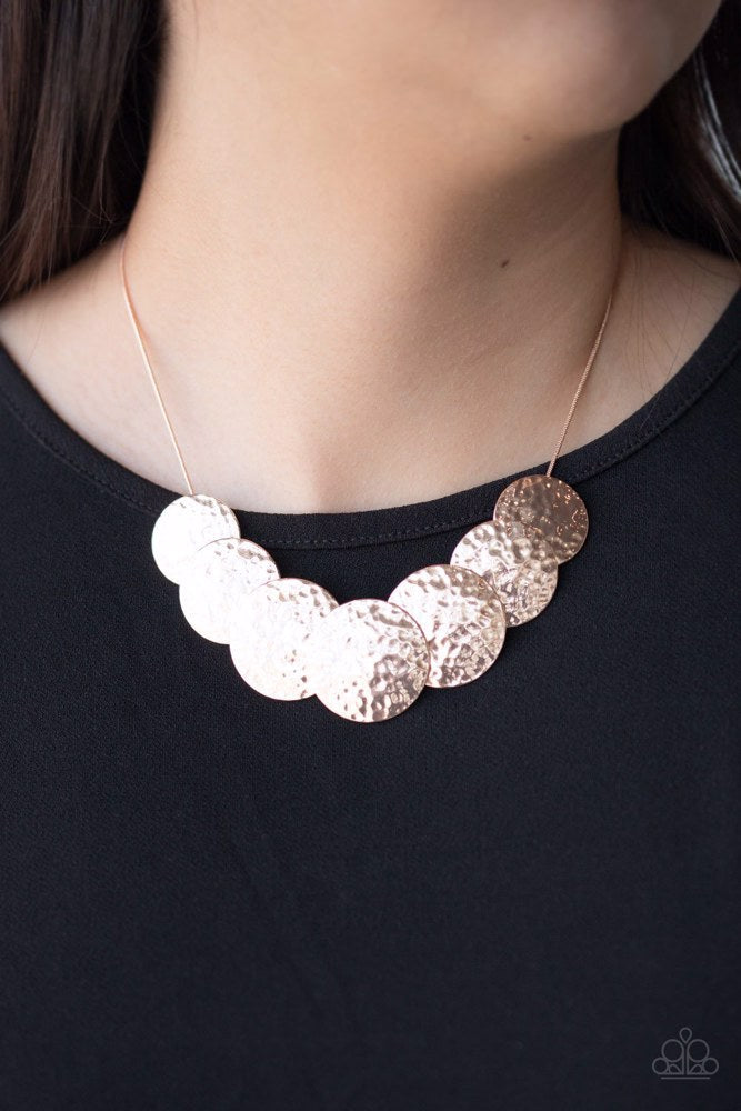 Hammered rose gold discs slide along a rounded snake chain, overlapping into a blinding statement piece below the collar. Features an adjustable clasp closure.