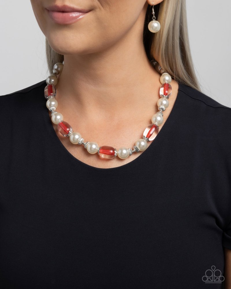Oversized pearl beads alternate with transparent acrylic beads, each showcasing a bold red stripe at the center. Decorative silver accents separate the beads, adding a refined touch to the design. Features an adjustable clasp closure.