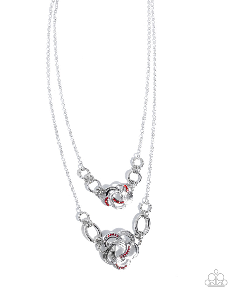 Two layers of dainty silver chains cascade below the neck, each featuring interwoven silver rings adorned with airy silver floral frames encrusted with red rhinestones. The intricate circular designs create a dynamic and eye-catching layered look. Features an adjustable clasp closure.