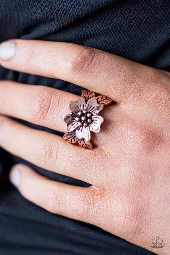 Etched in lifelike texture, a copper tropical flower blooms across the finger, creating a whimsical band. Features a stretchy band for a flexible fit.