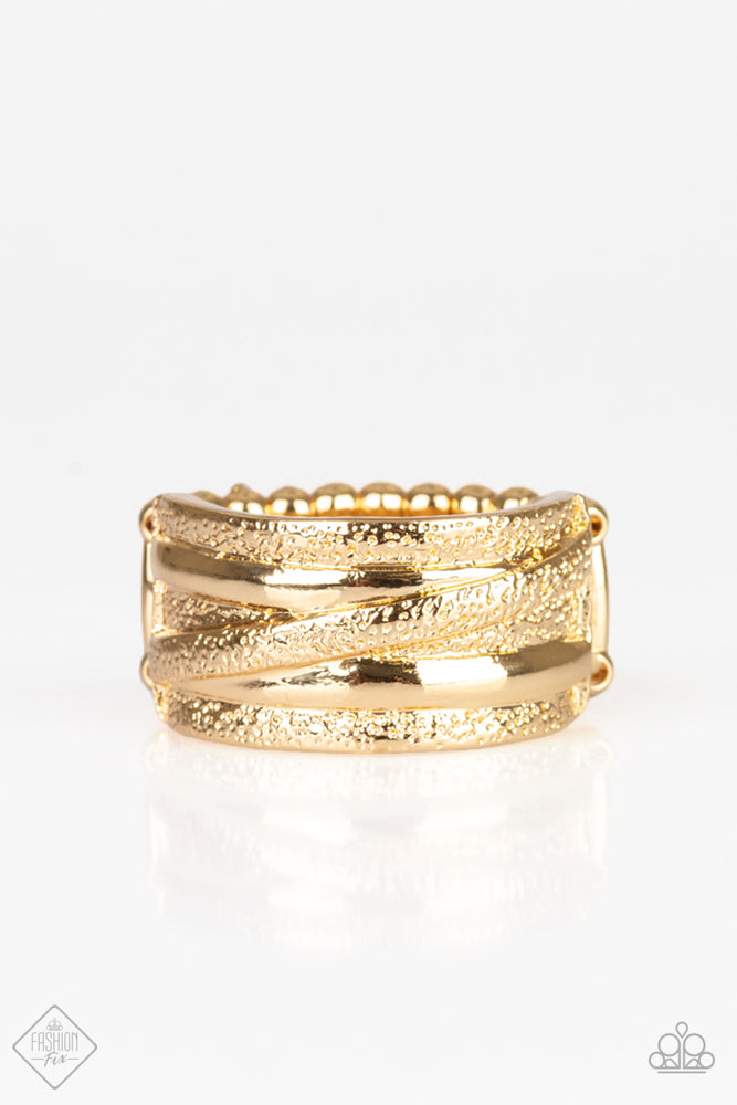 Delicately hammered in shimmery textures, glistening gold bands wrap around the finger for a refined look. Features a stretchy band for a flexible fit.