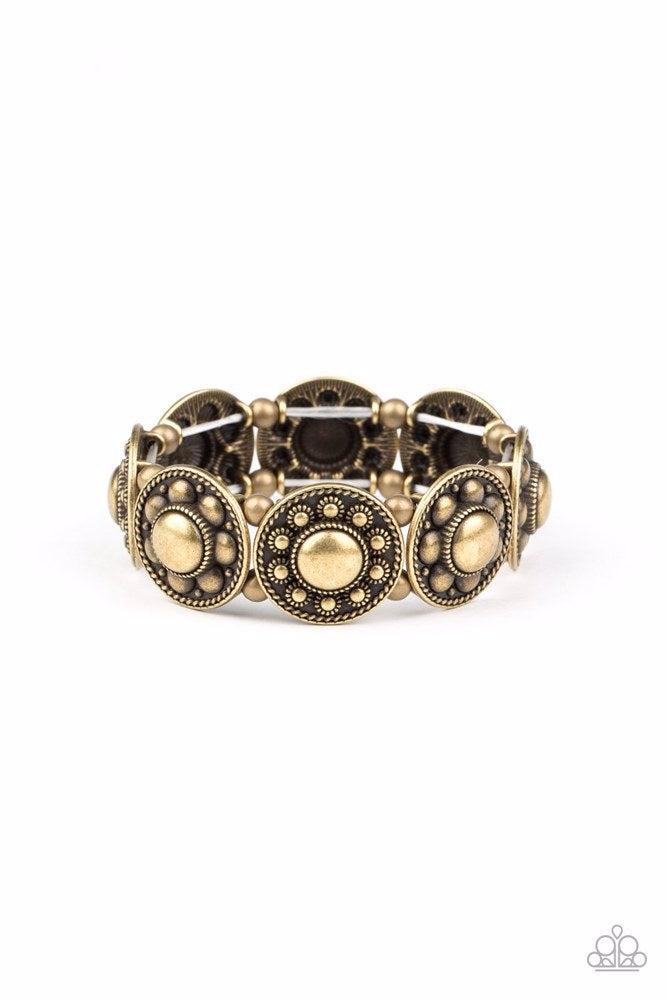 Studded and dotted in decorative floral patterns, antiqued brass frames are threaded along stretchy bands around the wrist for a seasonal flair.