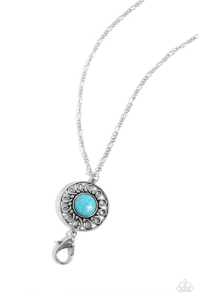 An oversized turquoise stone adorns the center of an antiqued silver frame radiating with silver studded and wire-like detail, creating an authentic artisan-inspired pendant. A lobster clasp hangs from the bottom of the design to allow a name badge or other item to be attached. Features an adjustable clasp closure.