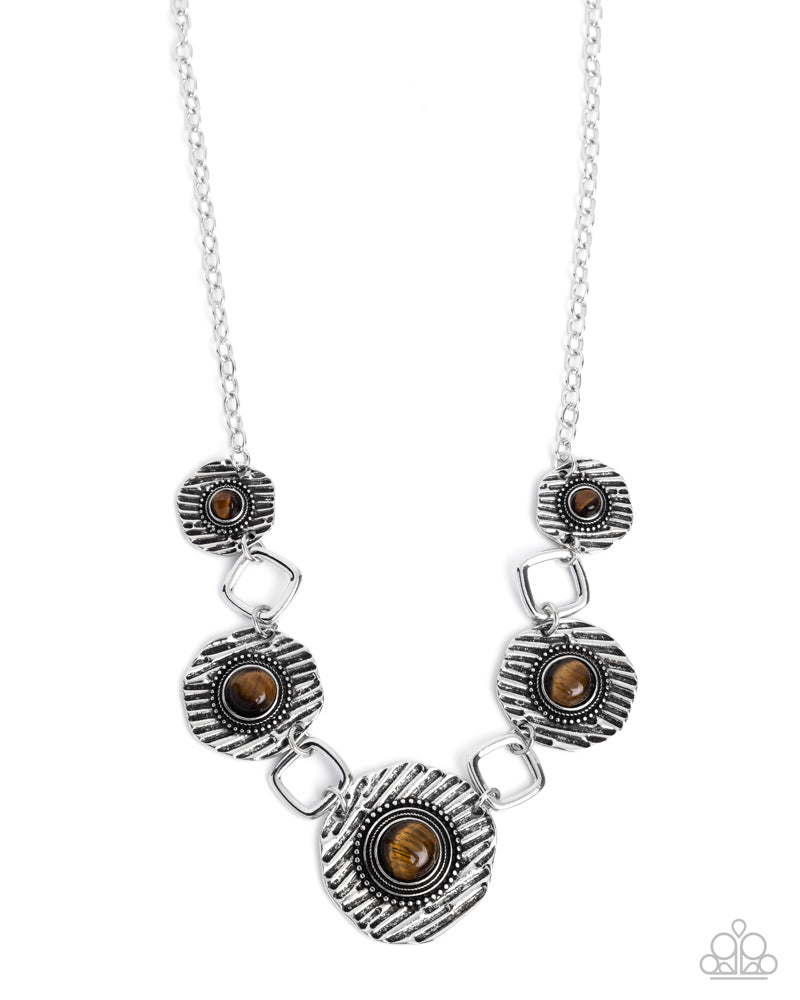 Suspended from a dainty silver chain, textured silver discs featuring bold tiger's eye stone accents, link together by airy silver square frames. The intricate patterns and pops of color combine for a stylish and artistic design. Features an adjustable clasp closure. As the stone elements in this piece are natural, some color variation is normal.